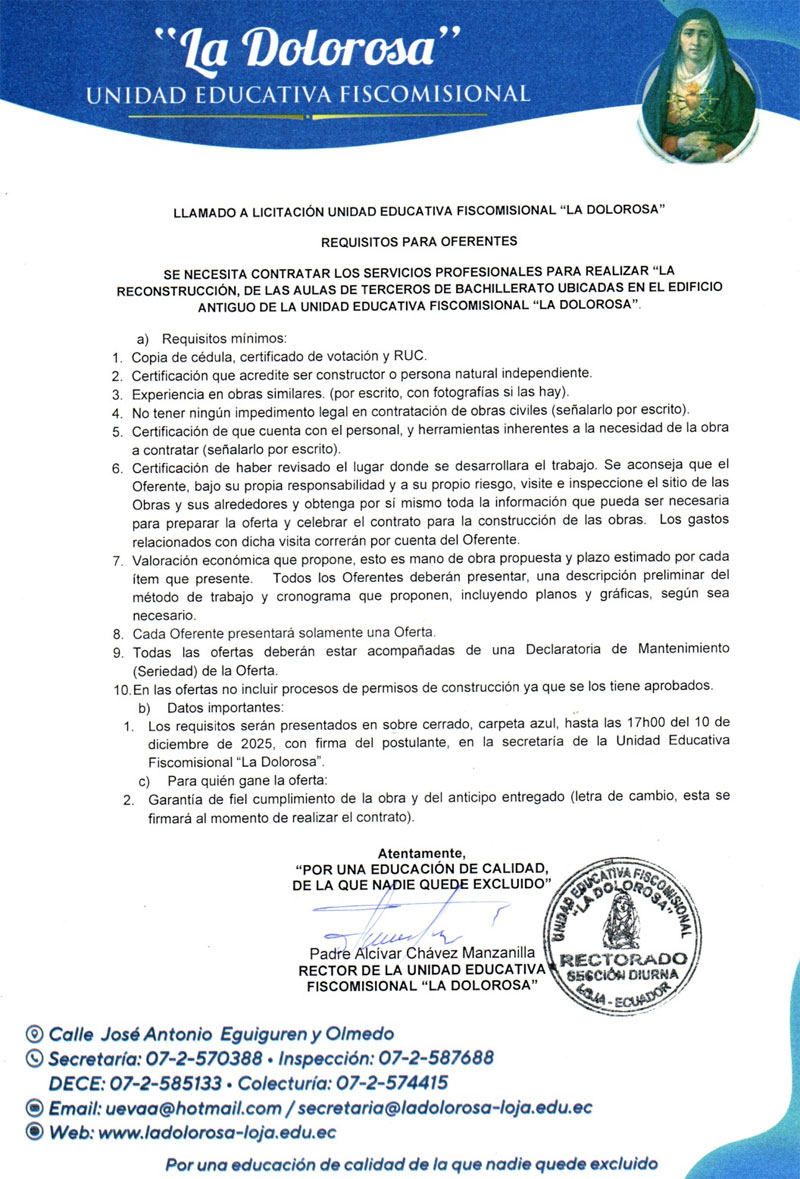 La Unidad Educativa Fiscomisional “La Dolorosa”, está regentada por el Padre Néstor Alcívar Chávez Manzanilla como Rector, el Magister Pedro Patricio Espinoza como Vicerrector, la Magister Solange Aguilera como Coordinadora de la jornada vespertina, Magister Denisse Lima como Coordinador de la jornada nocturna.